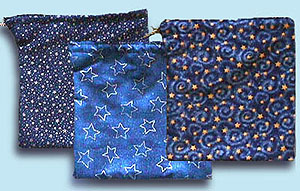 GALAXY This style features a silver starfield on a dark blue background. Finished with a silver braid drawstring. $20.00 |